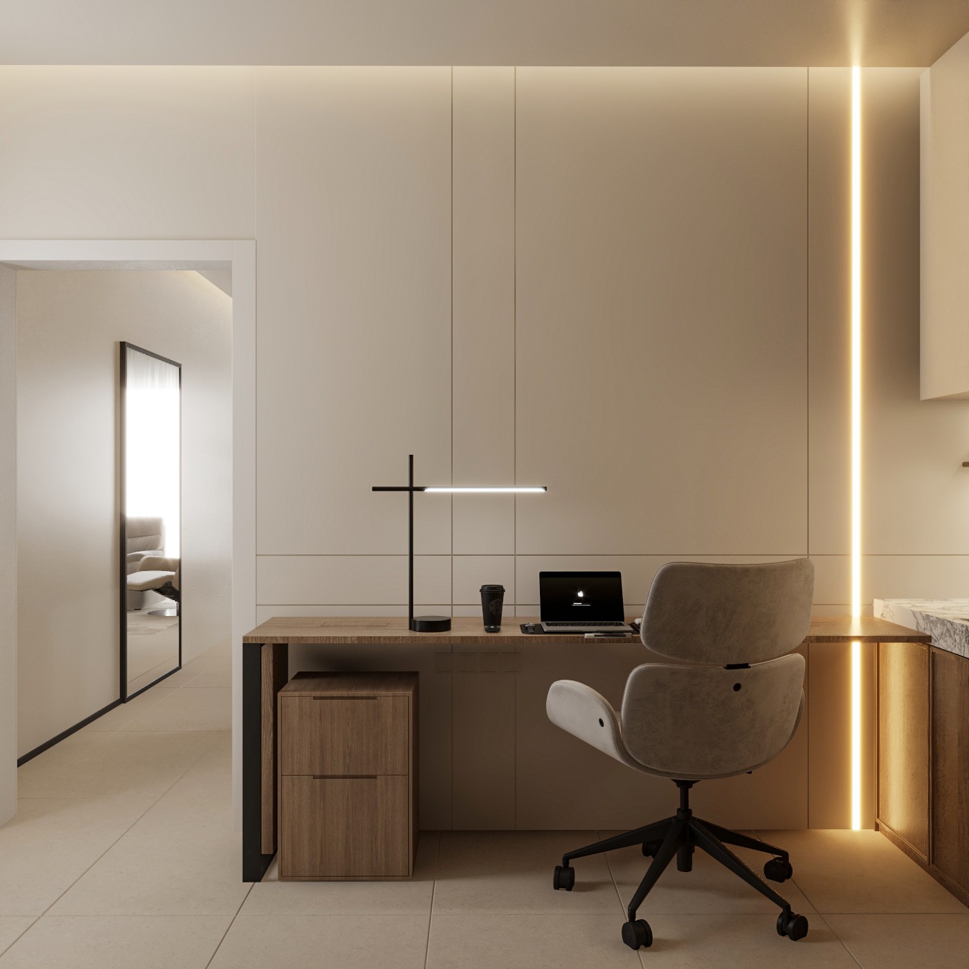 This kitchen design blends minimalism with warmth through clean lines, soft beige cabinetry, and natural wood textures. Integrated appliances, sleek finishes, and concealed storage deliver both function and elegance.