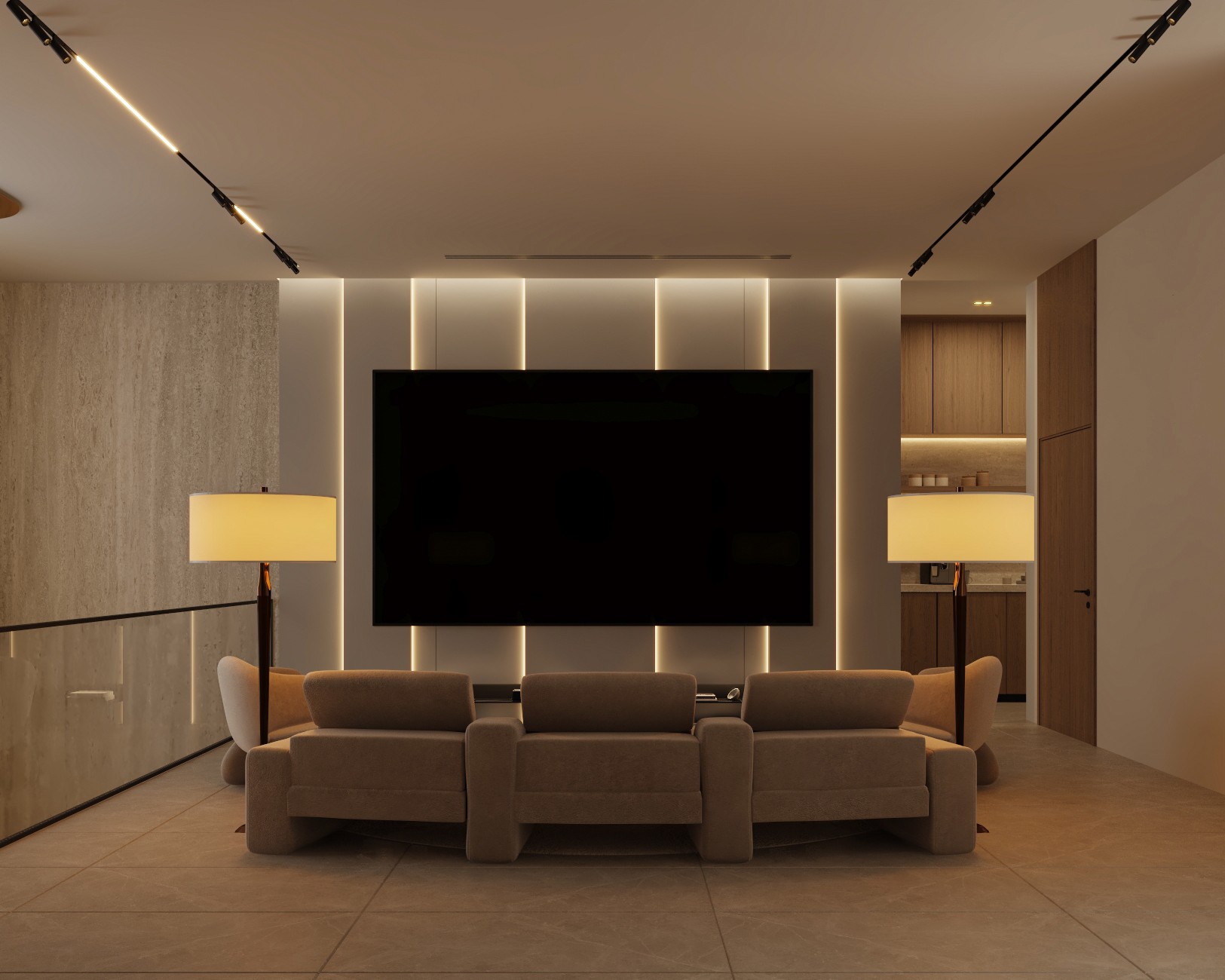 A warm, modern home theater designed for immersive moments — where comfort meets cinematic elegance.