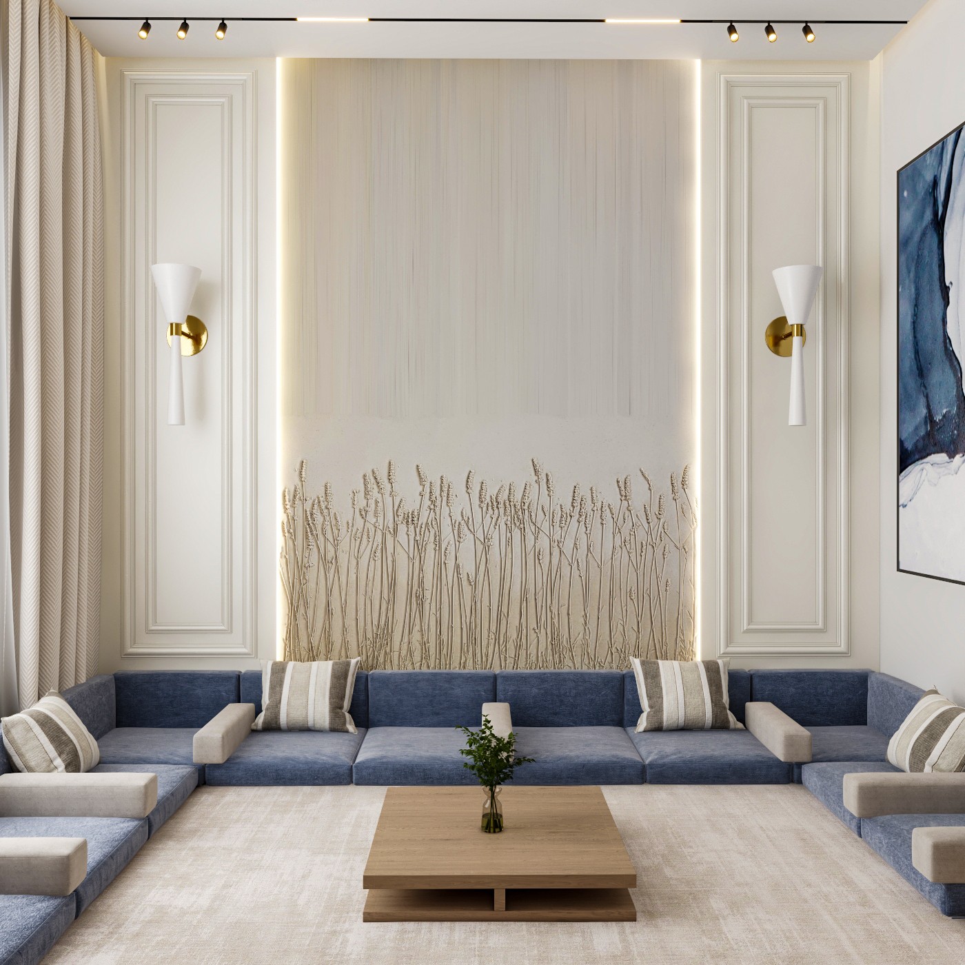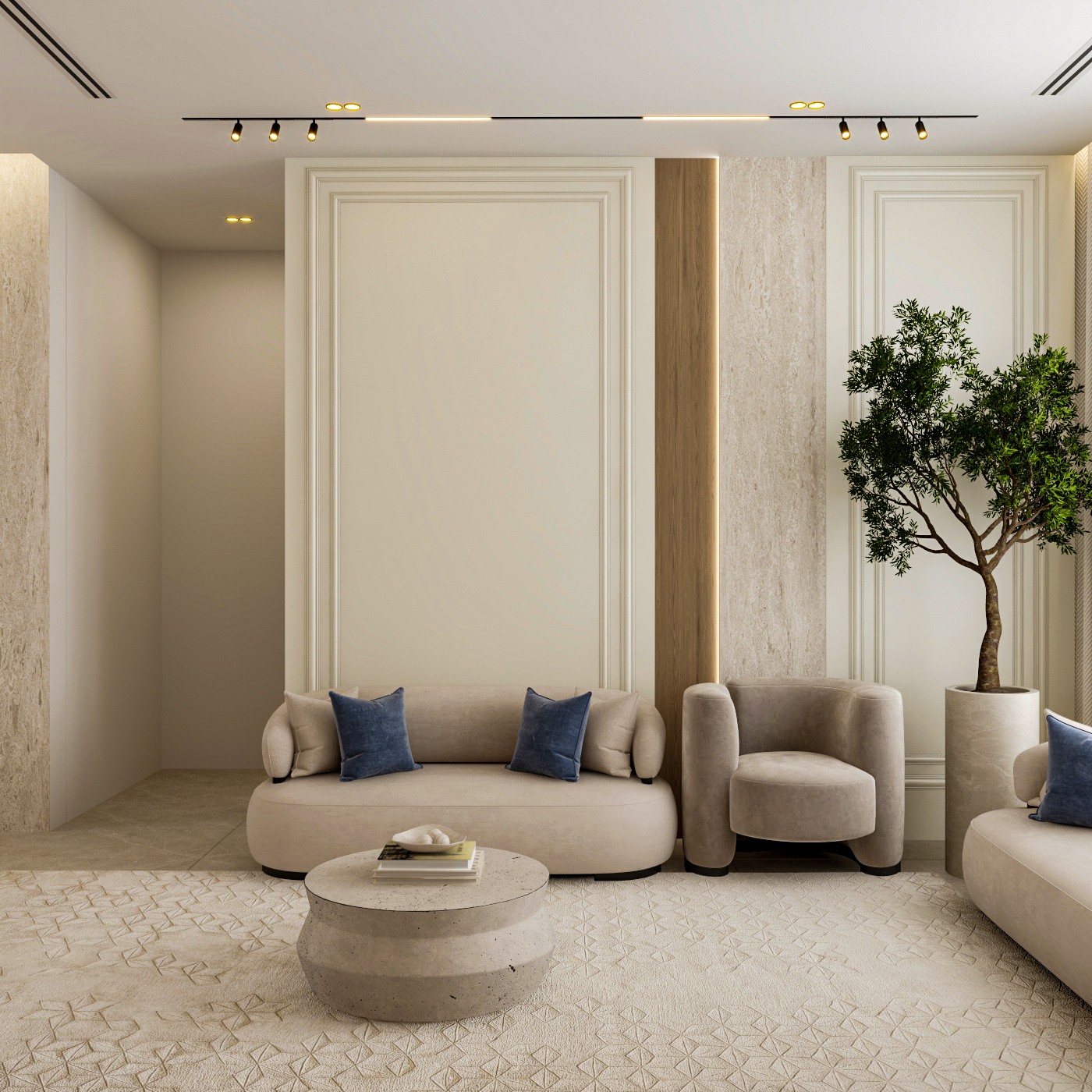 A serene and luxurious gathering space characterized by soft, neutral tones—creamy whites and beiges—accented with natural textures and subtle metallics.