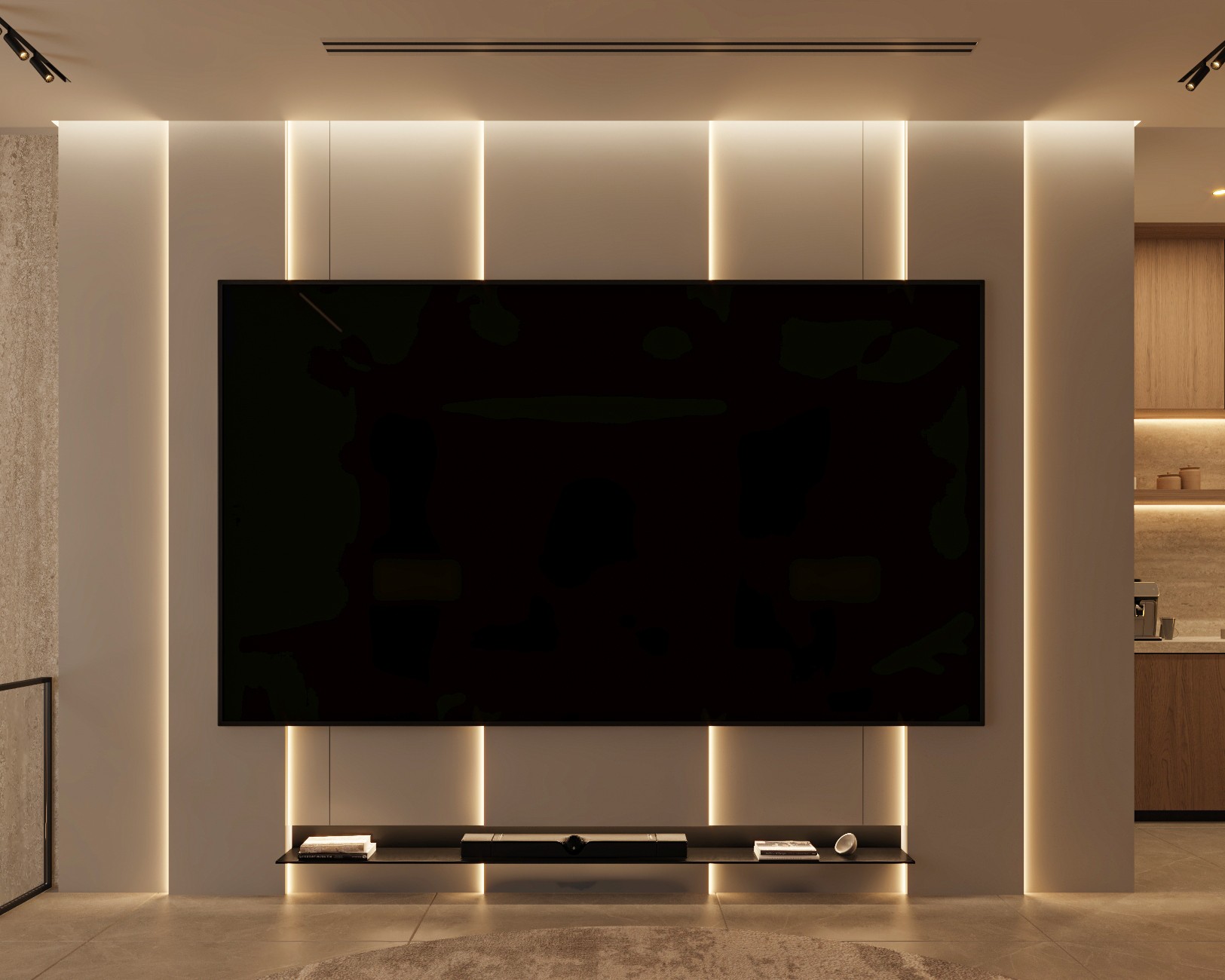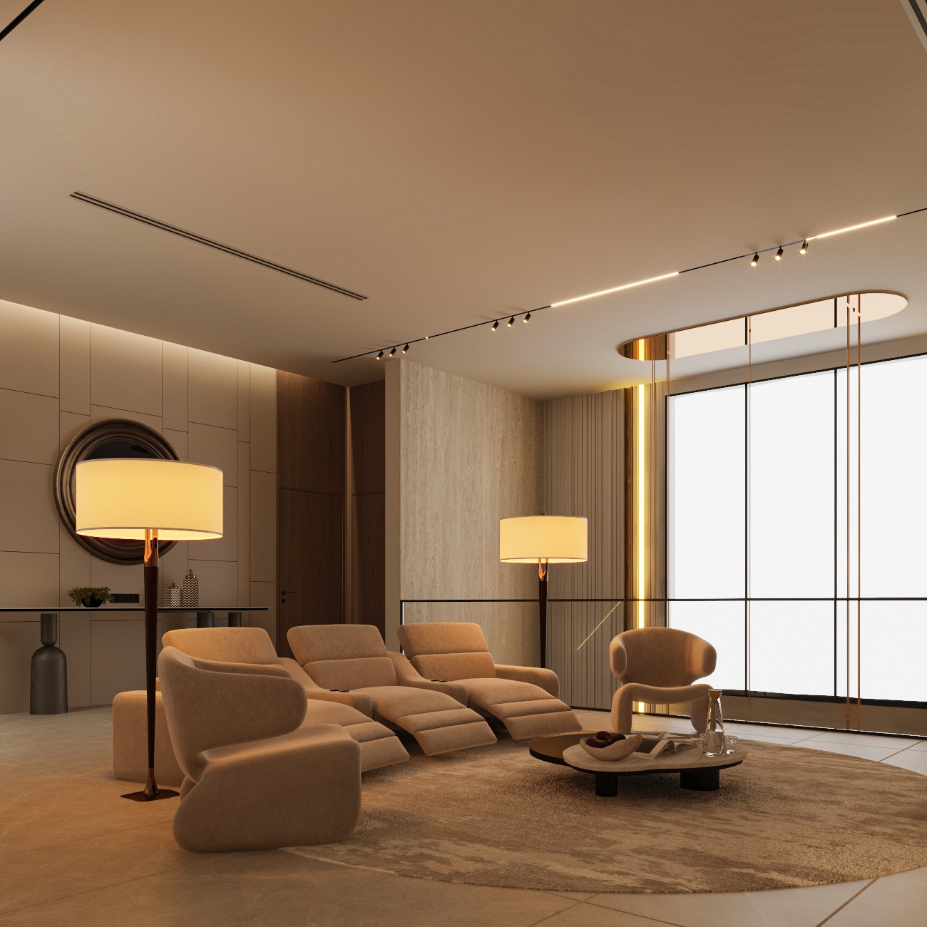 This home cinema design combines sleek modern lines with a warm, intimate atmosphere. Rich textures, ambient lighting, and layered materials create a cozy yet refined space, balancing comfort with cinematic sophistication. The result is an immersive environment tailored for both relaxation and entertainment.