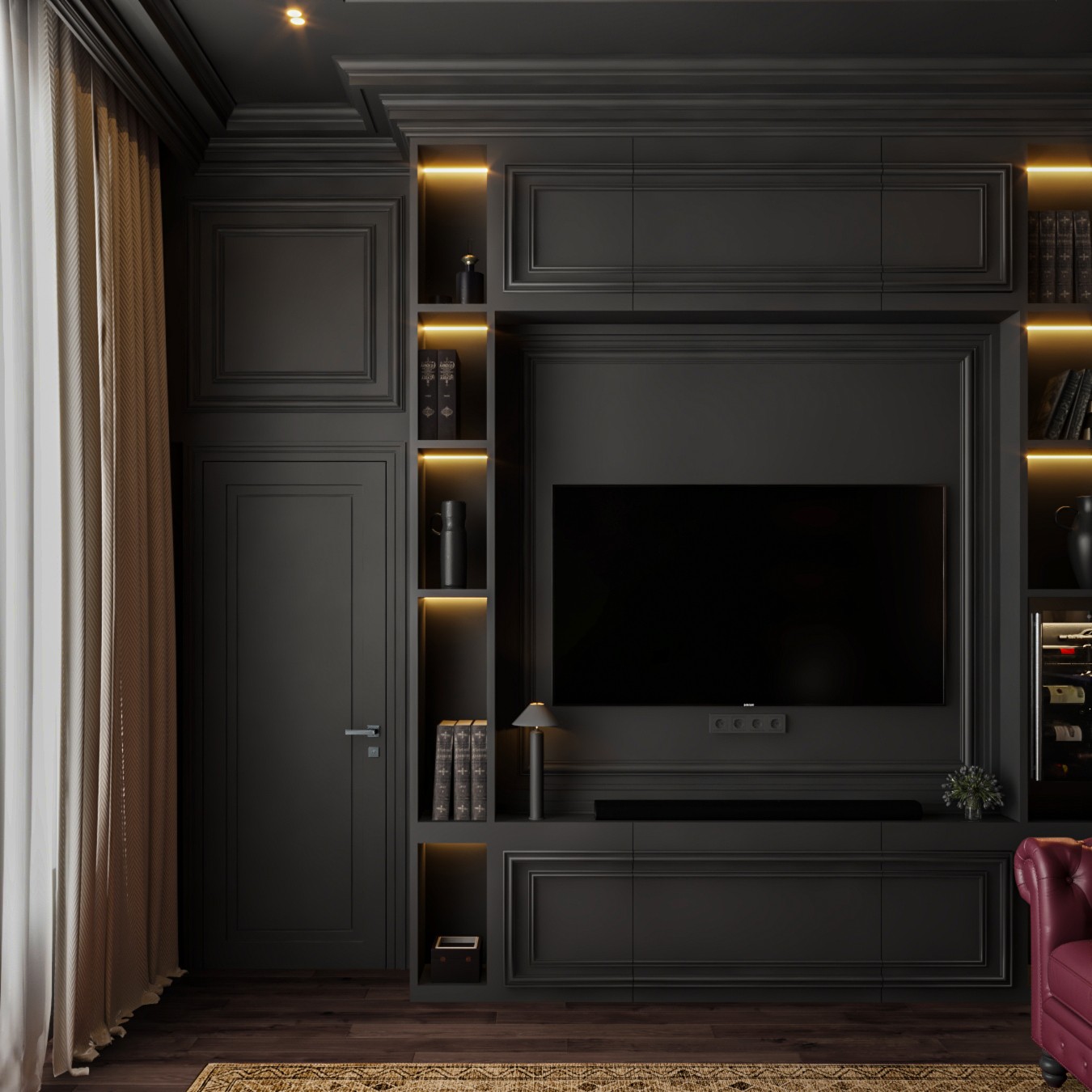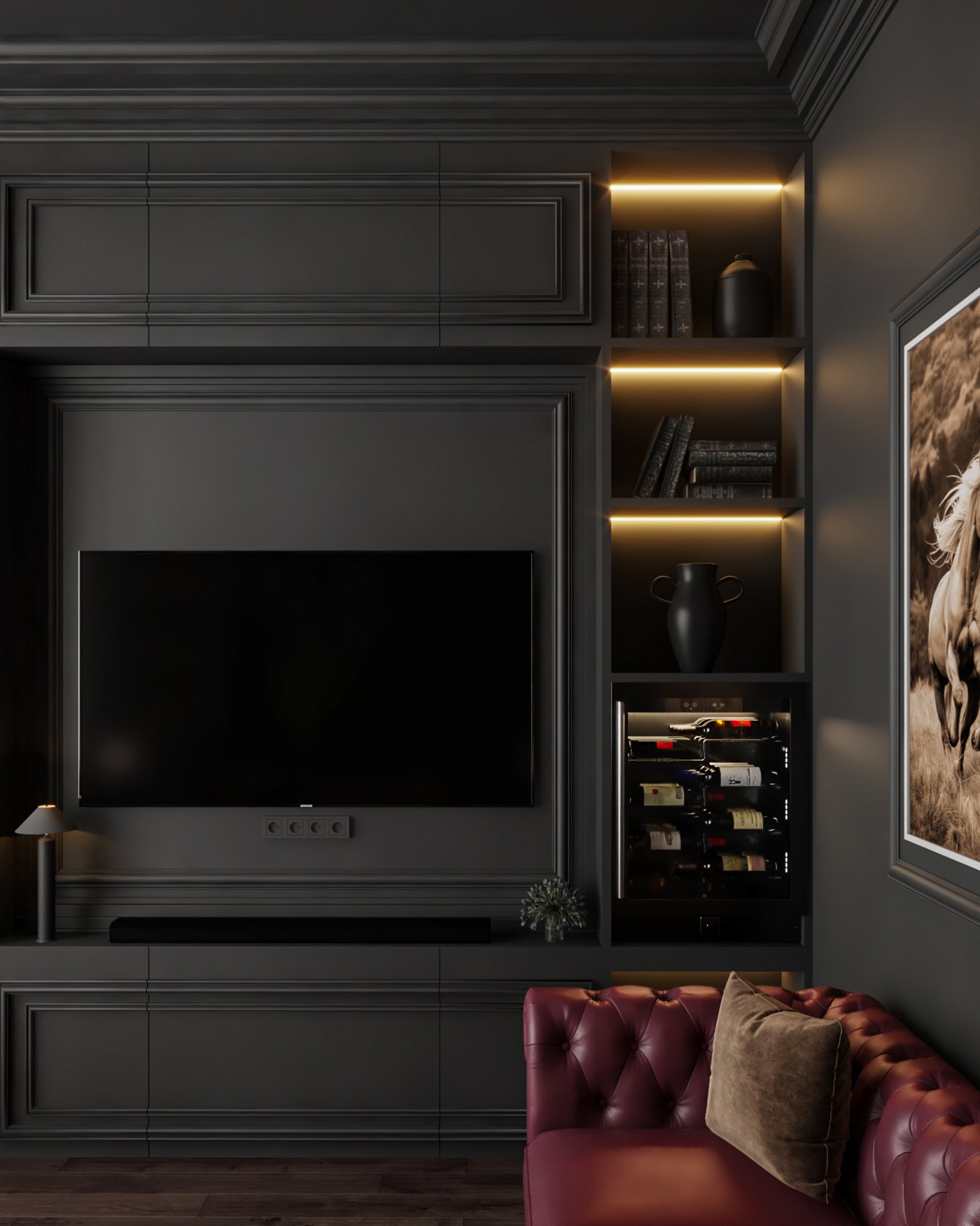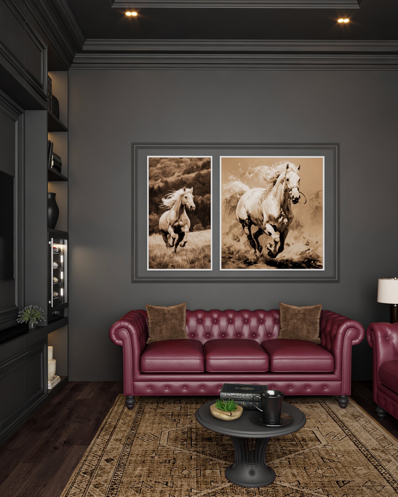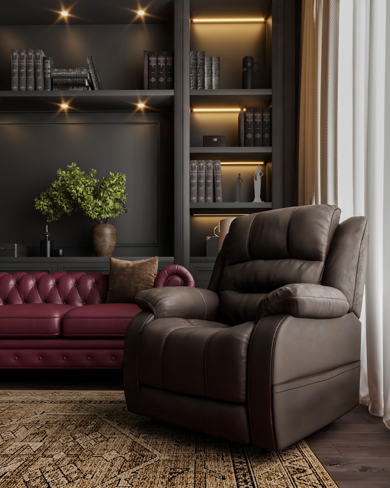 This lavish majlis interior exudes a sense of old-world sophistication and comfort. The walls and built-in shelving are painted a deep charcoal, creating a dramatic backdrop for the rich furnishings. A pair of luxurious tufted leather sofas in a deep burgundy hue and a plush brown armchair invite relaxation, centered around a classic black coffee table. Recessed lighting and lamps with soft, warm light illuminate the space, highlighting the extensive collection of books and decor.