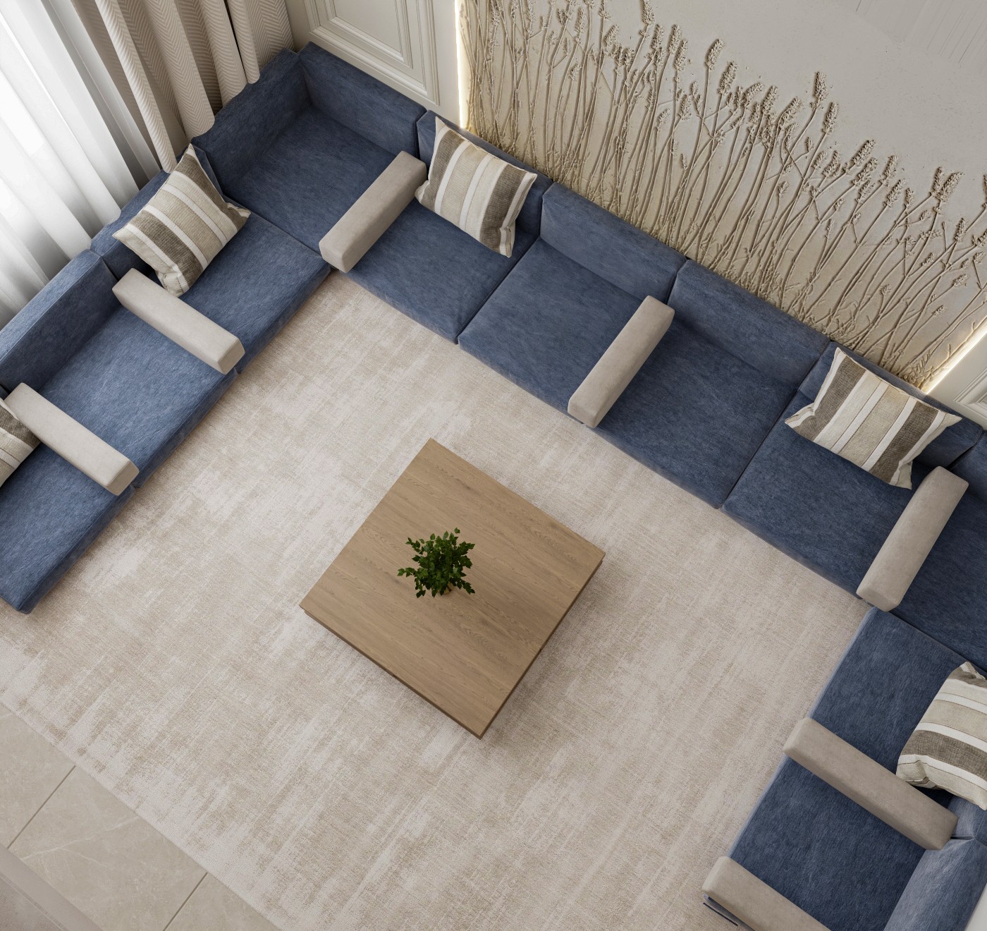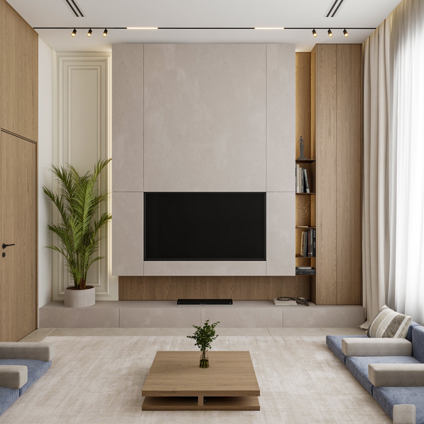 This elevated majlis design offers a contemporary interpretation of traditional Middle Eastern comfort, with a chic U-shaped floor seating arrangement in serene blue upholstery. The room is anchored by a minimalist wooden coffee table on a plush, textured rug. Subtle wall decor featuring a delicate, nature-inspired motif, highlighted by concealed lighting, adds a refined touch to this inviting and culturally rich space