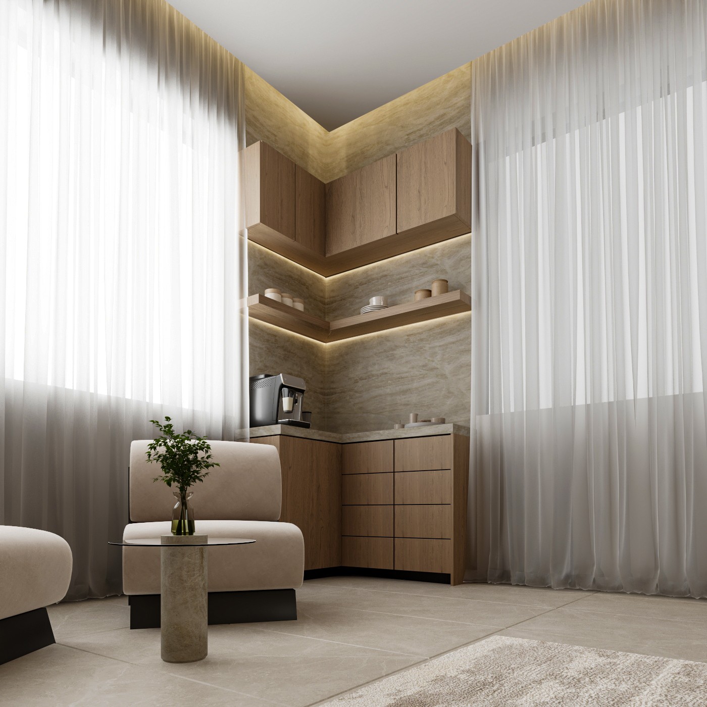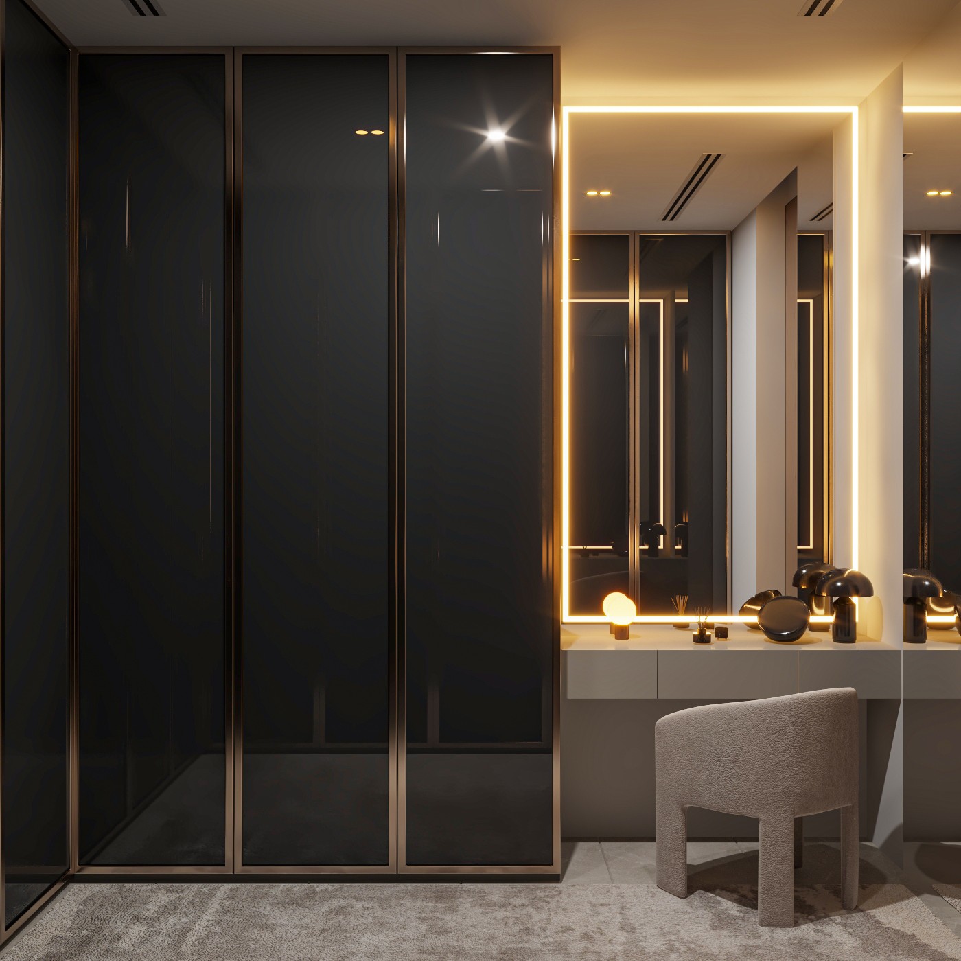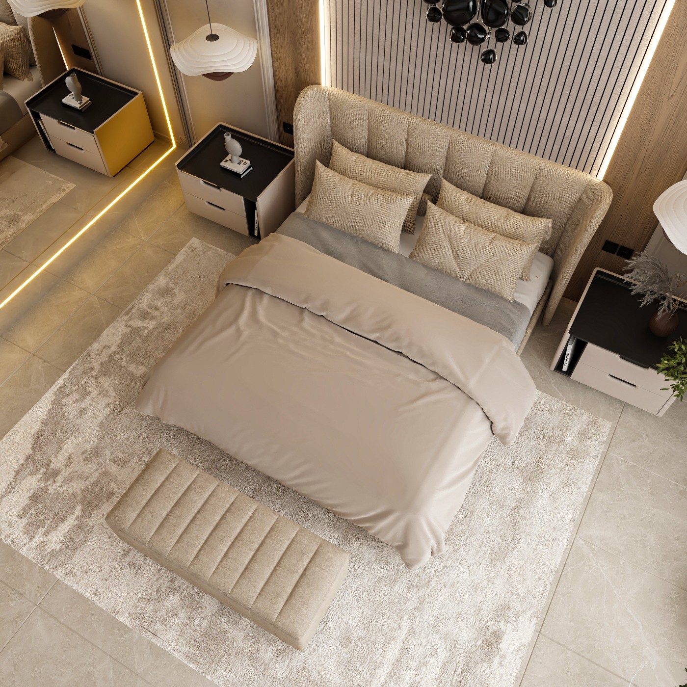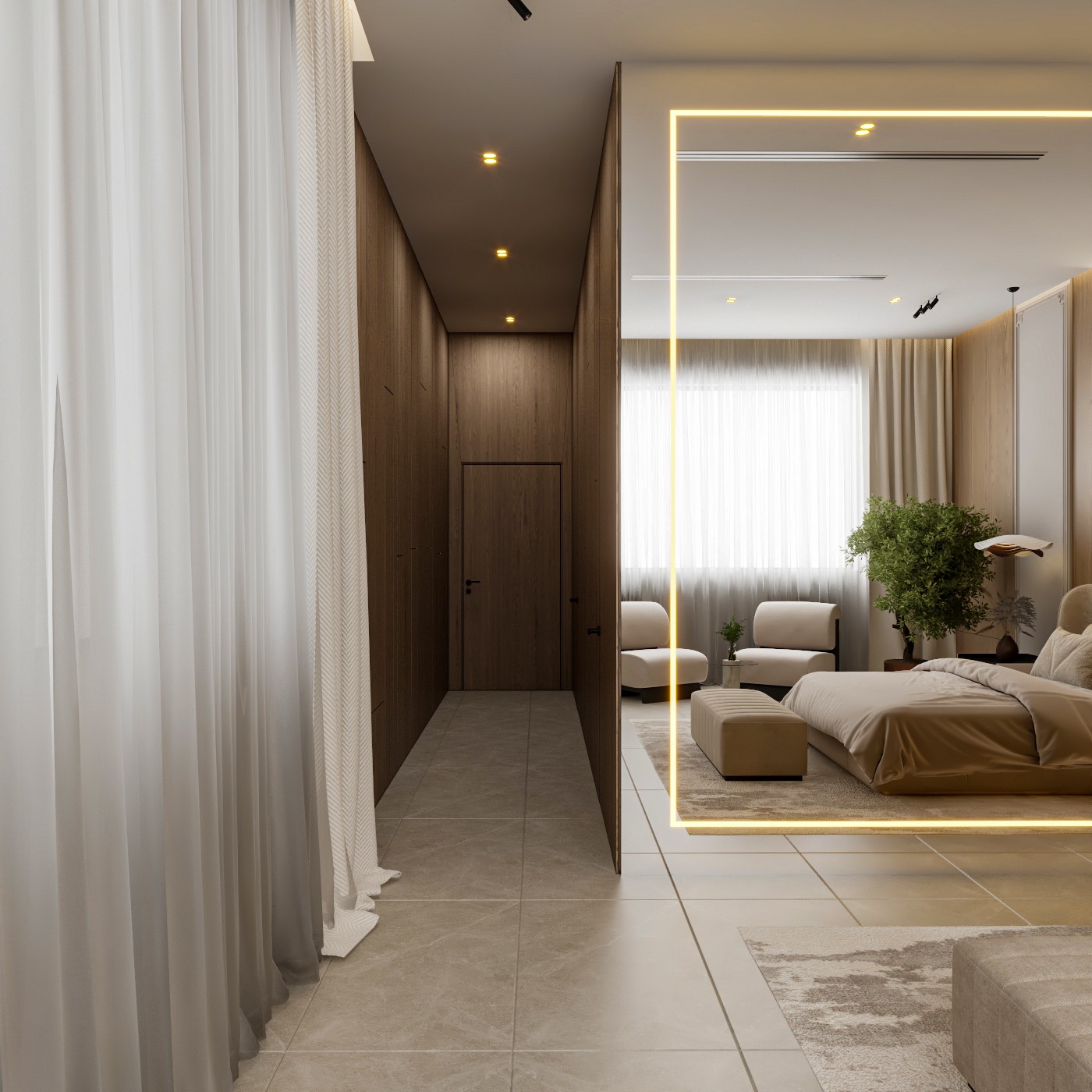 This master bedroom design envelops the space in understated elegance, with soft, neutral tones that create a serene and sophisticated ambiance. Subtle textures and refined architectural details lend depth and visual interest, while plush accents such as layered linens and padded furnishings emphasize both comfort and luxury. The overall effect is a tranquil sanctuary perfect for rest and retreat.