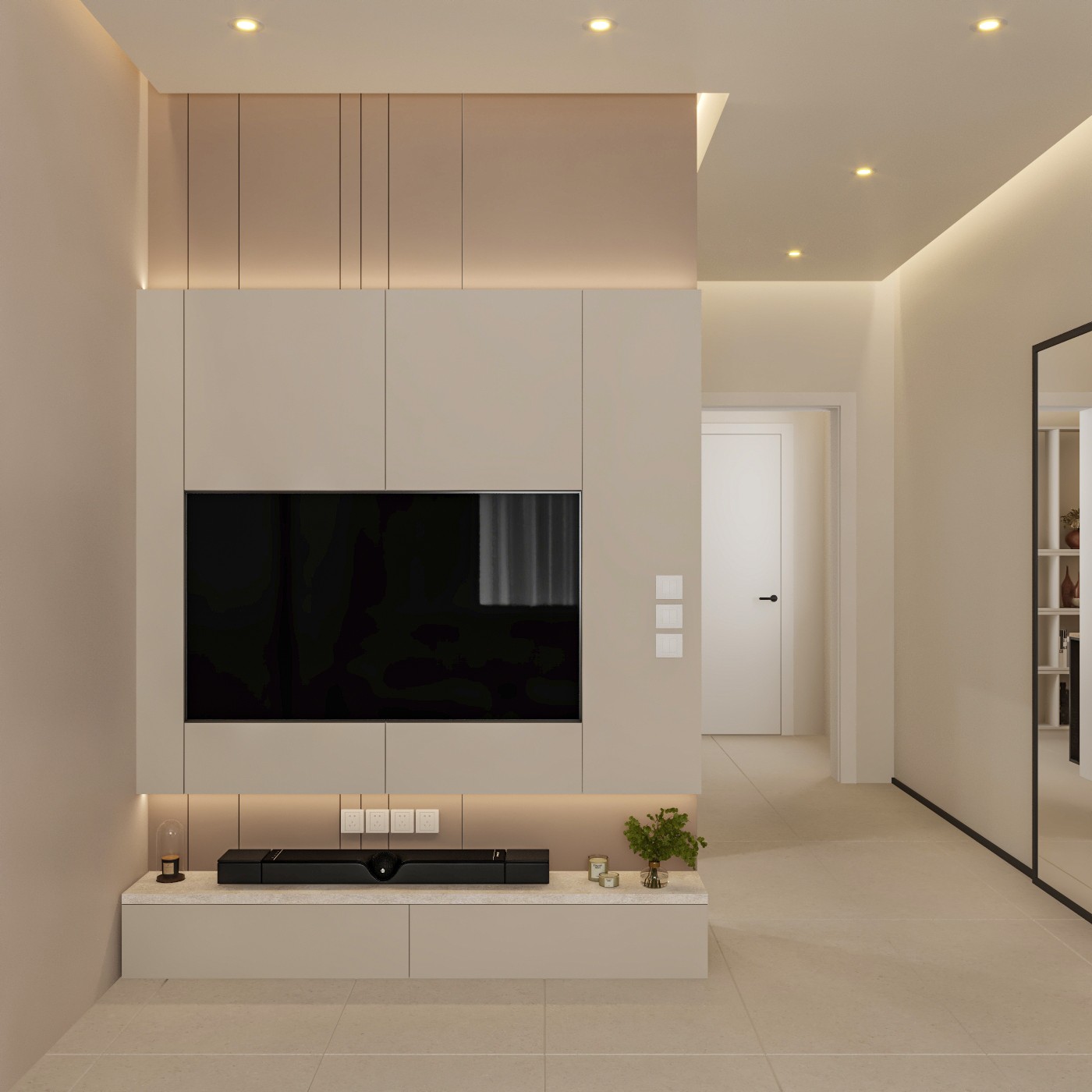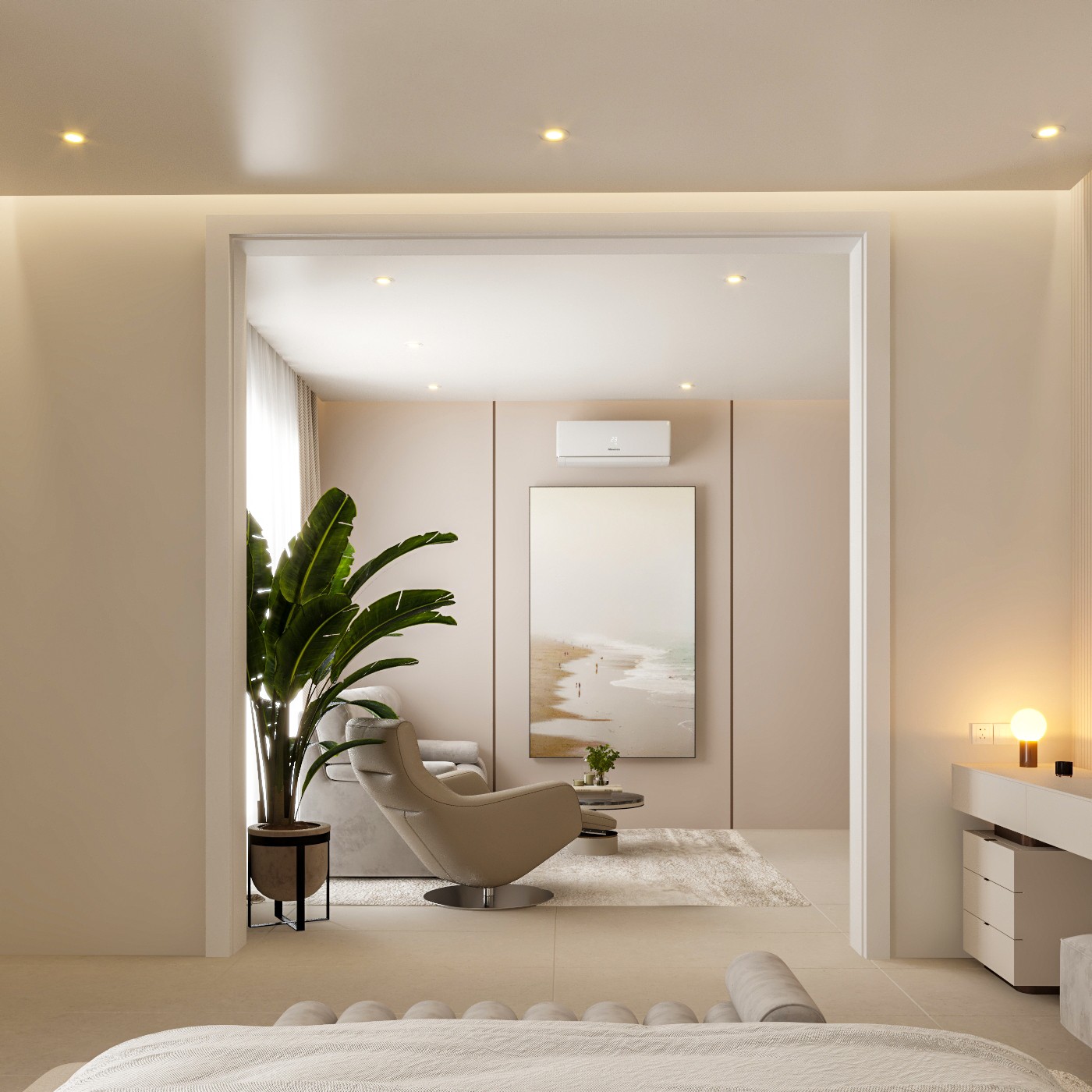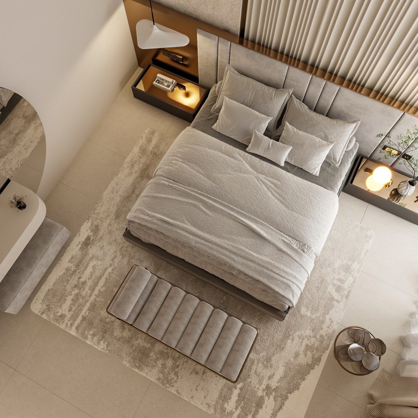 This contemporary bedroom showcases a luxurious and serene atmosphere with a focus on textures and warm lighting. The centerpiece is a large, upholstered gray bed complemented by a plush bench at its foot. The feature wall behind the bed combines two different textures: a natural, stone-like surface and a light-colored, vertically paneled wall, both softly lit to create a calming ambiance.